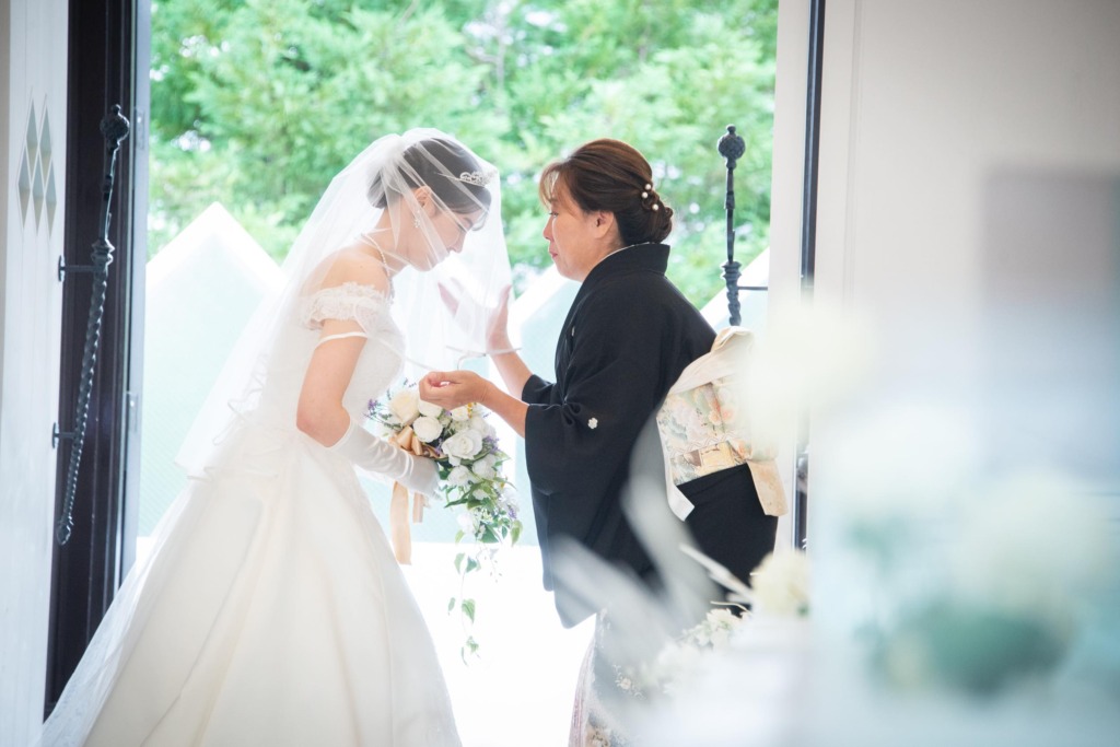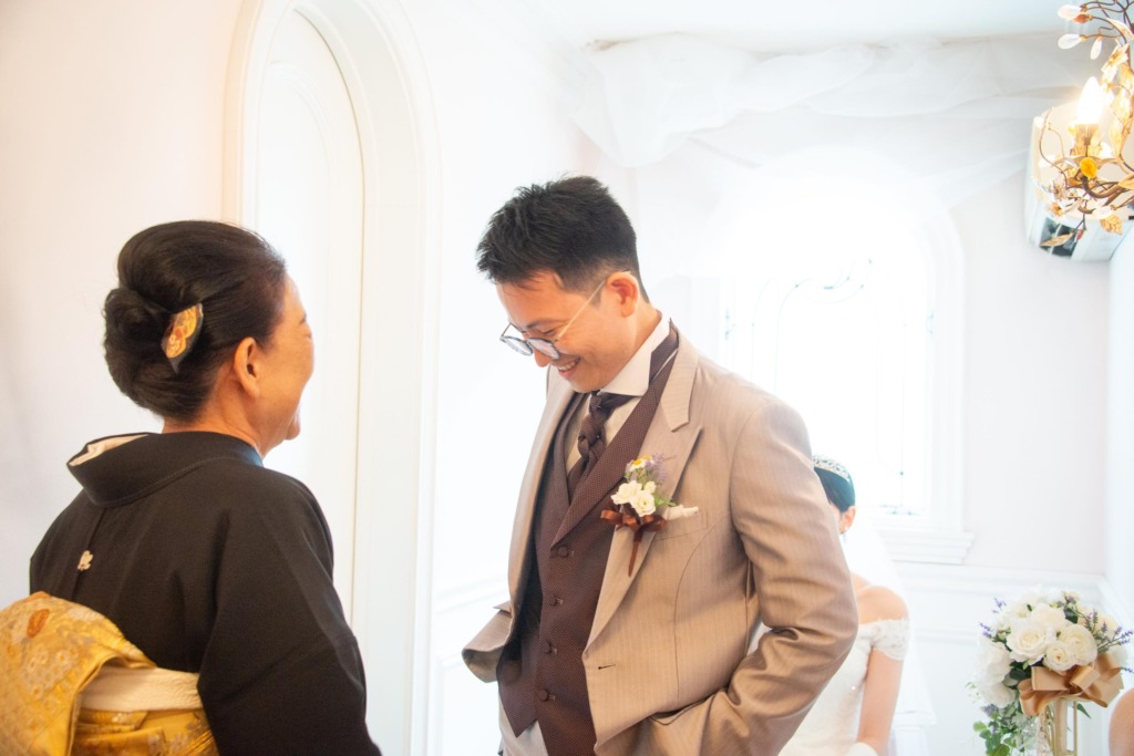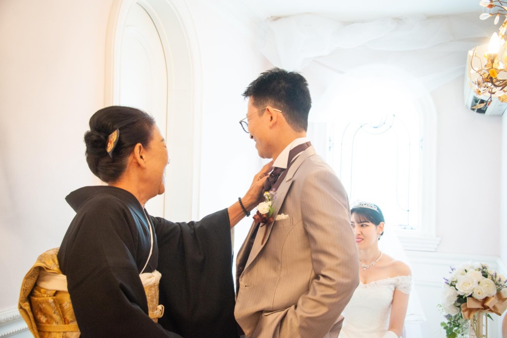 ネクタイを直すお母様の優しい目と少し照れる新郎様の表情が印象的でした