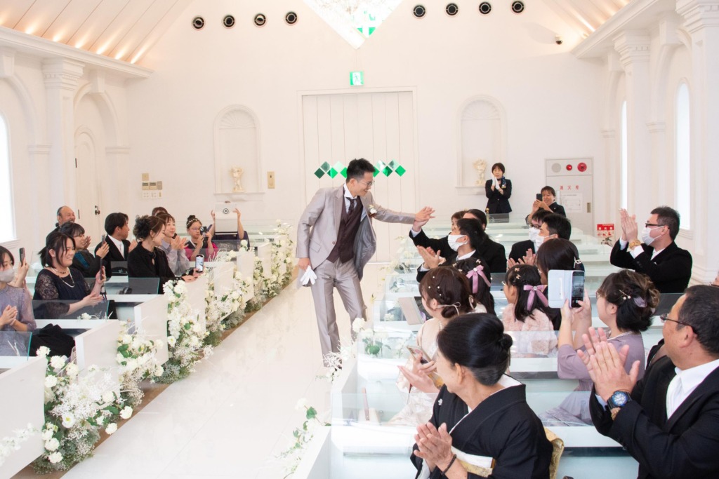 バージンロードを笑顔で歩きながらゲストの皆様とハイタッチするなどアットホームなご入場シーン