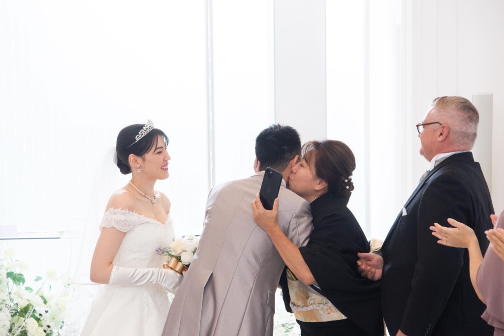 最後に新婦のお母様が「娘を頼むよ!」と新郎様にもキスをされてみえ
