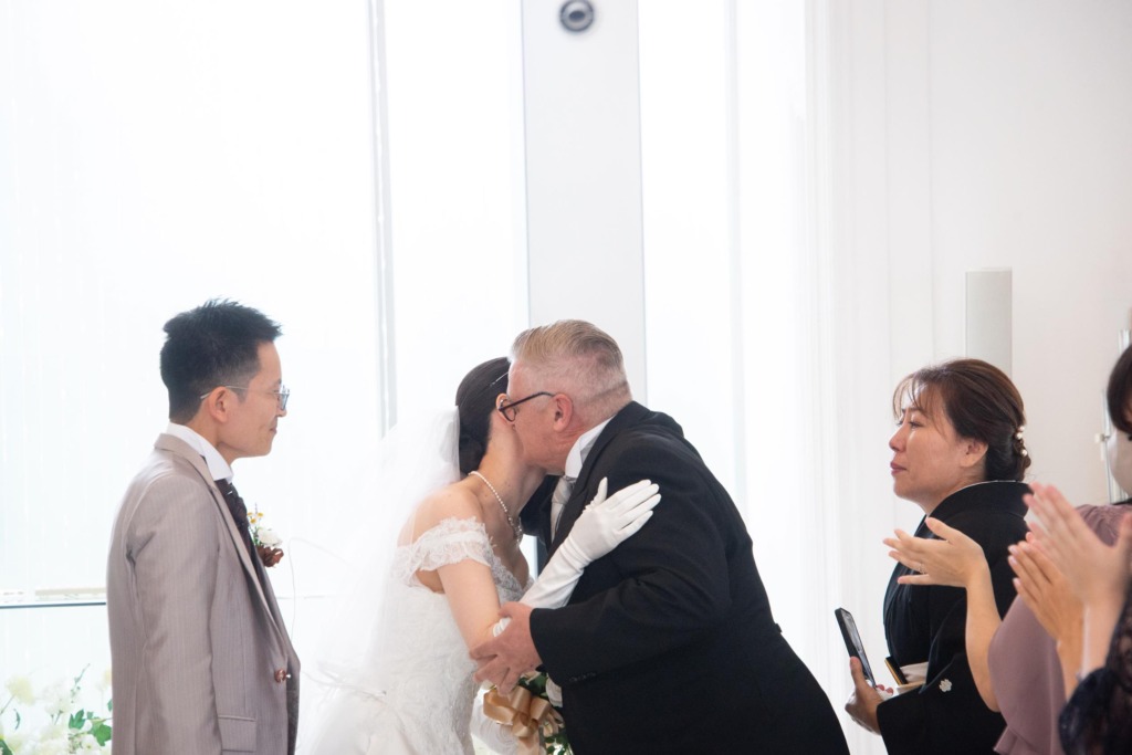 新婦のお父様が新婦様を引き寄せほっぺにお祝いのキス