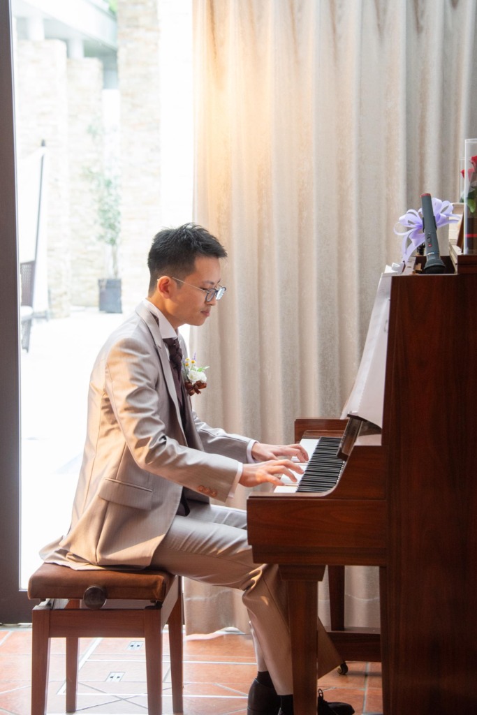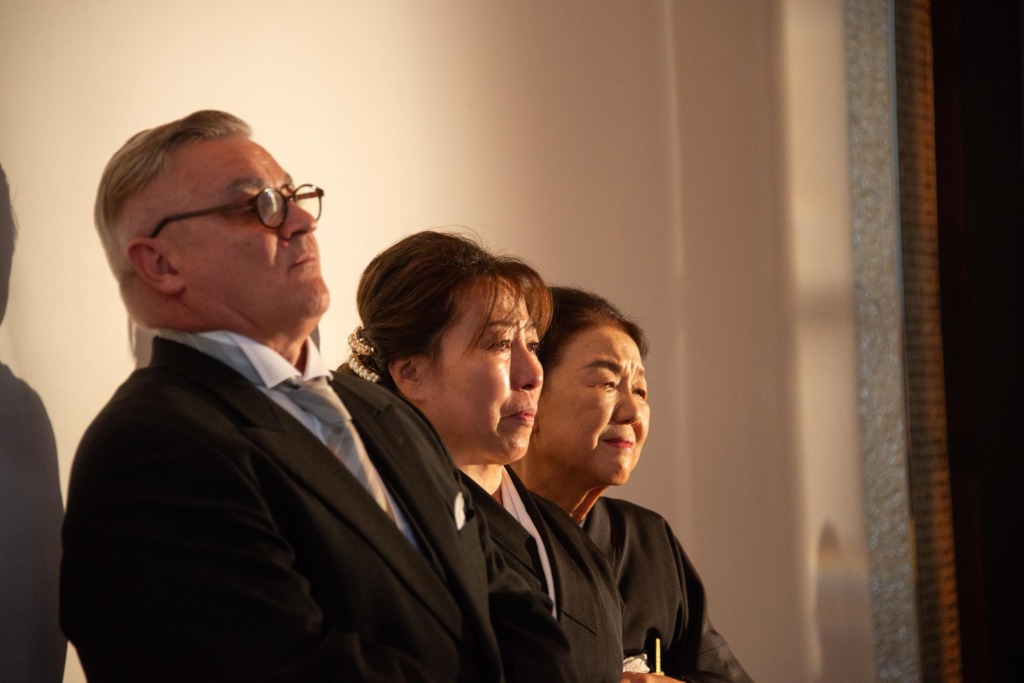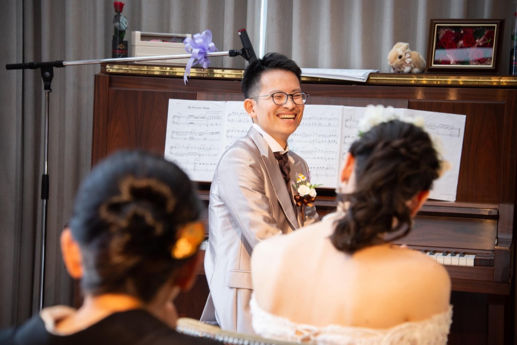 一生懸命演奏する新郎様の背中を見守る新婦様と新郎様のお母様