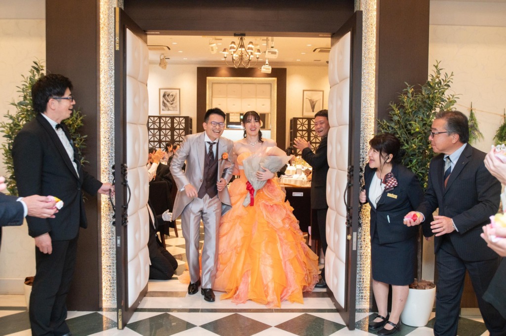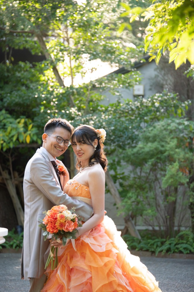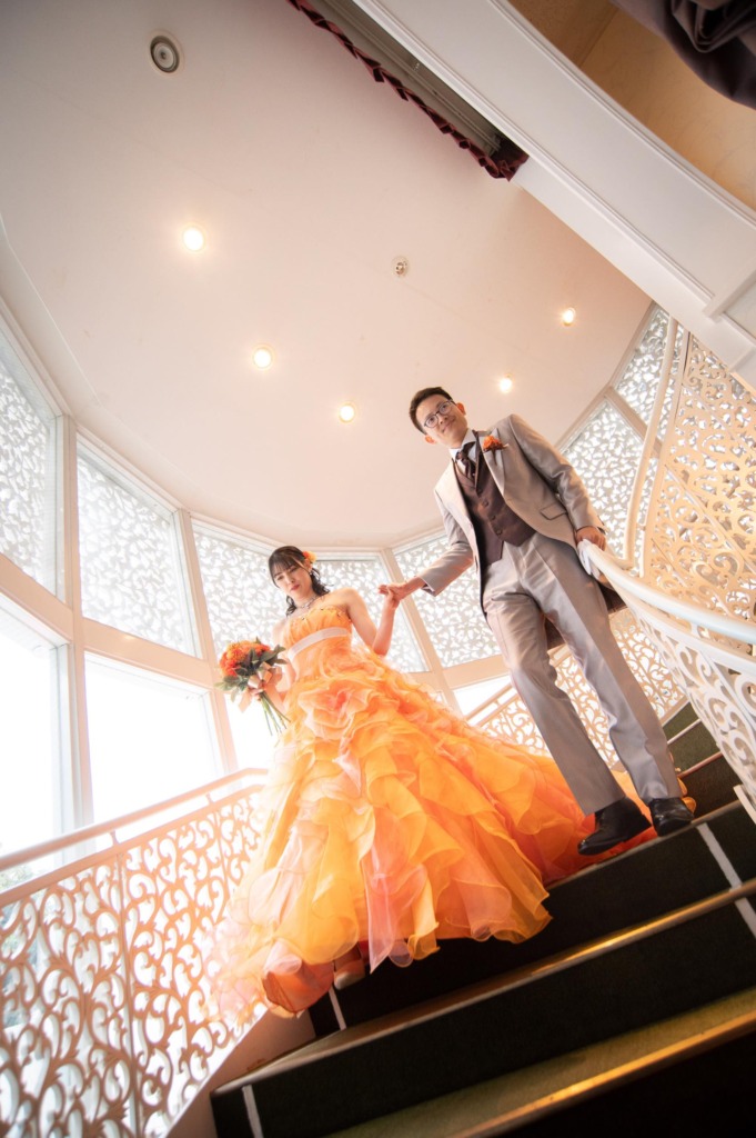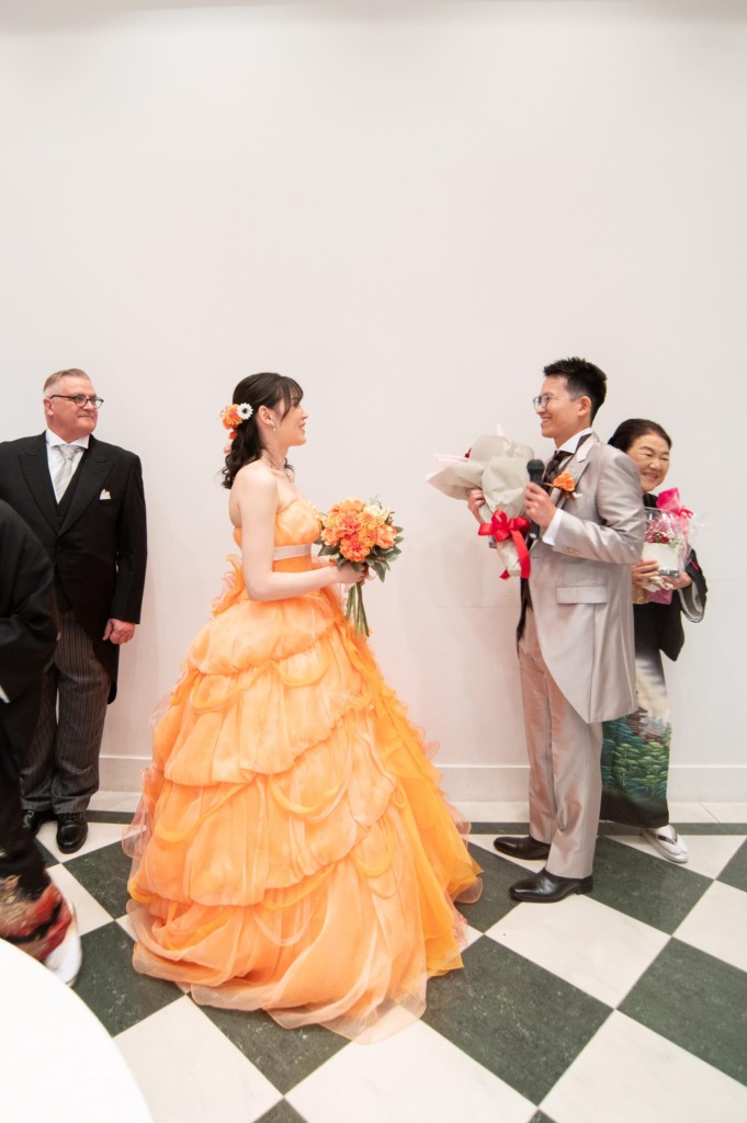 ウエディングドレスに代わりお色直しで可愛いオレンジのカラードレスへチェンジ!
