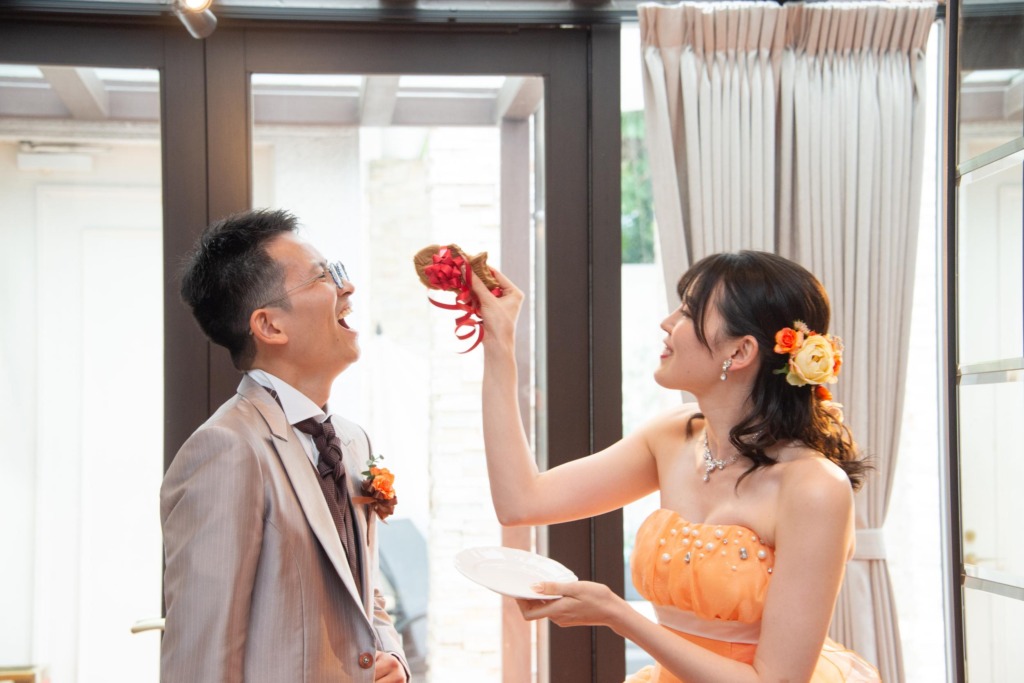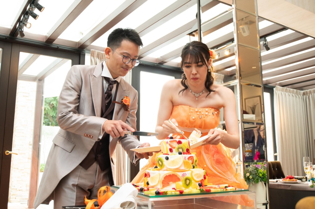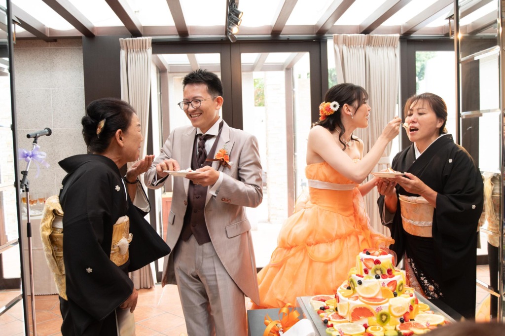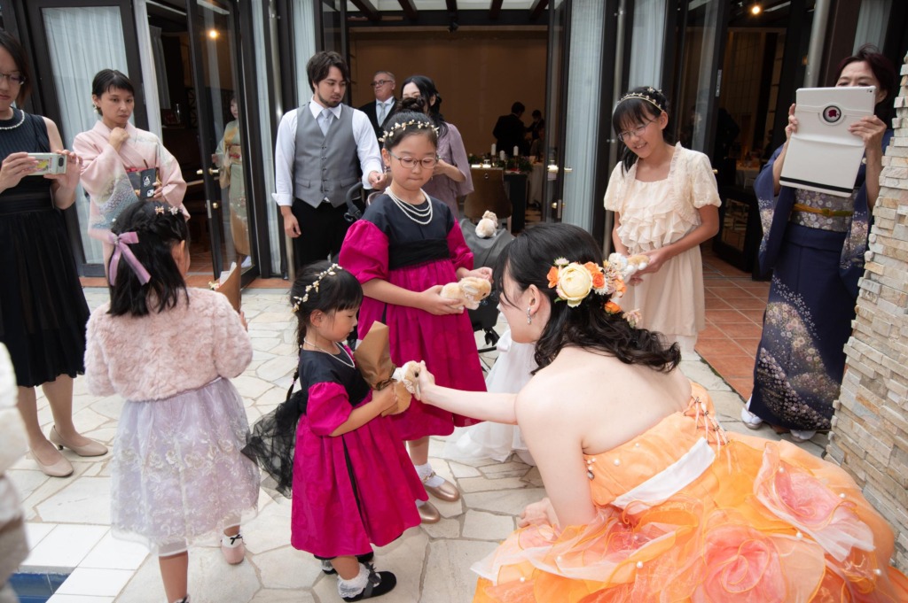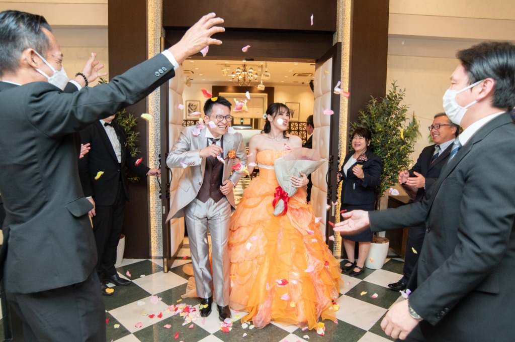 ウエディングドレスに代わりお色直しで可愛いオレンジのカラードレスへチェンジ!